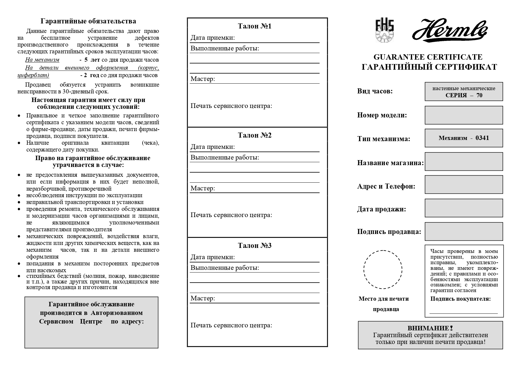 Инструкция к часам Hermle и гарантийный талон